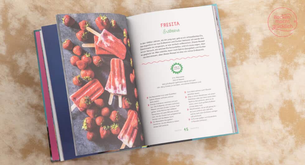Hinter dem etwas ungewöhnlichen Titel Paletas (Christian) steckt eine lateinamerikanische Zubereitungweise für Eis am Stiel, angefangen von Fruchteis bis hin zu cremigem Sahneeis. Neben Zucker gibt die Autorin immer auch Maisstärke und Wasser zum Grundrezept, damit das Ergebnis nicht einfach nur gefrorener Saft ist, sondern die richtige Konsistenz bekommt. Neben dem Fruchteis hat sie auch noch viele Varianten mit gezuckter Kondensmilch und normaler Milch, dazu vegane Sorten. Die Rezepte sind alle recht üppig und zuckerhaltig. Das Buch enthält viele tolle Bilder und schöne Ideen, klassische wie ausgefallene, unsere Kinder haben geschätzte 1000 Merk-Zettel hinein geklebt 😉