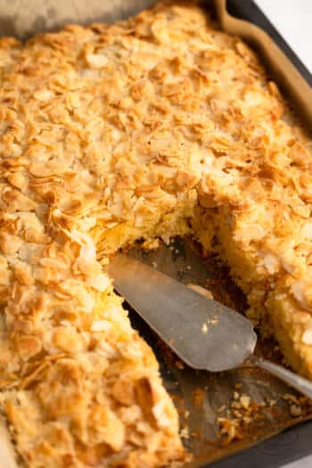 - Fertig backen: Zum Schluss backt ihr der Blitzkuchen fertig, bis die Mandel-Zucker-Kruste goldgelb sind. Dieses zweistufige Vorgehen hat sich bewährt und sorgt für ein gutes Zusammenspiel aus saftigem Teig und herrlich knusprigem Belag.