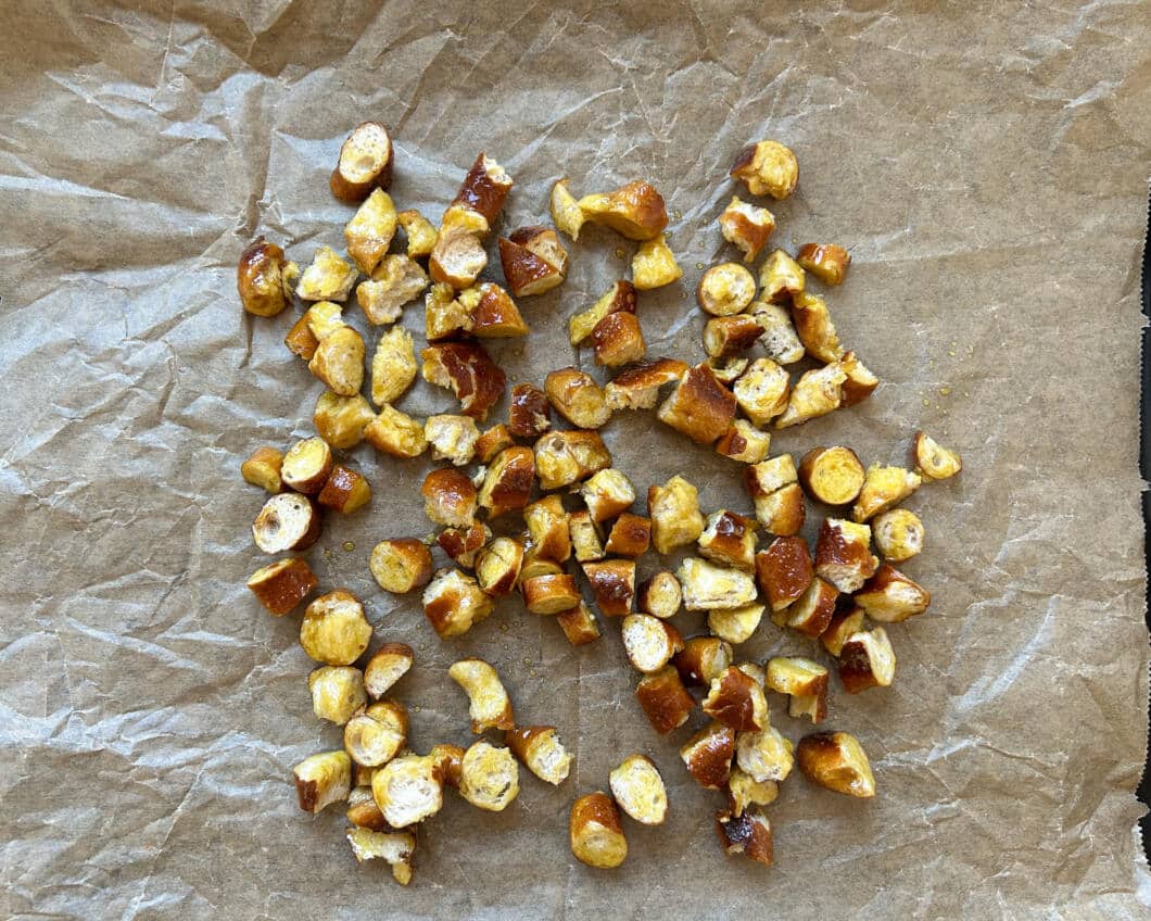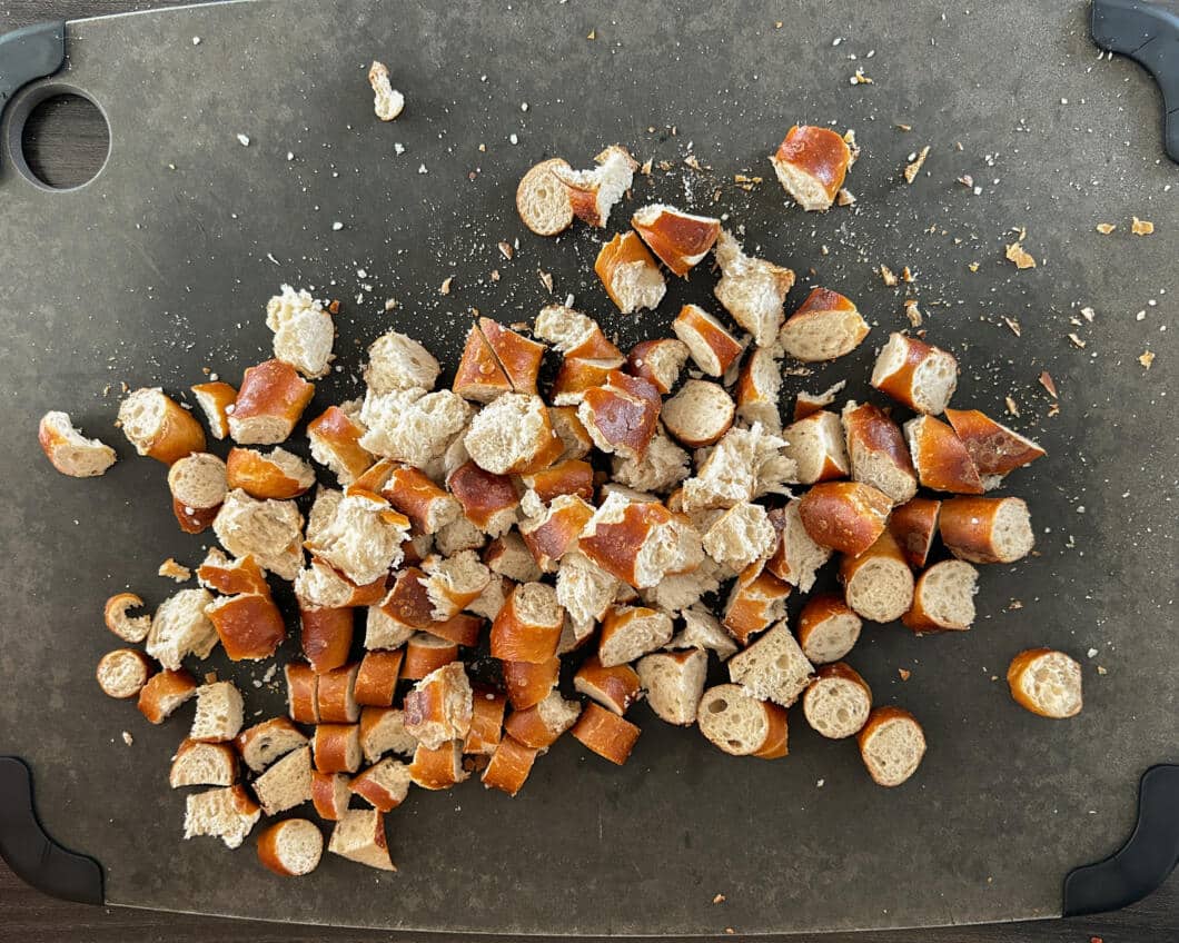 - Die Brezeln mit einem großen scharfen Messer in kleine Stücke schneiden oder brechen. Die Stücke sollten nicht zu unterschiedlich groß sein.