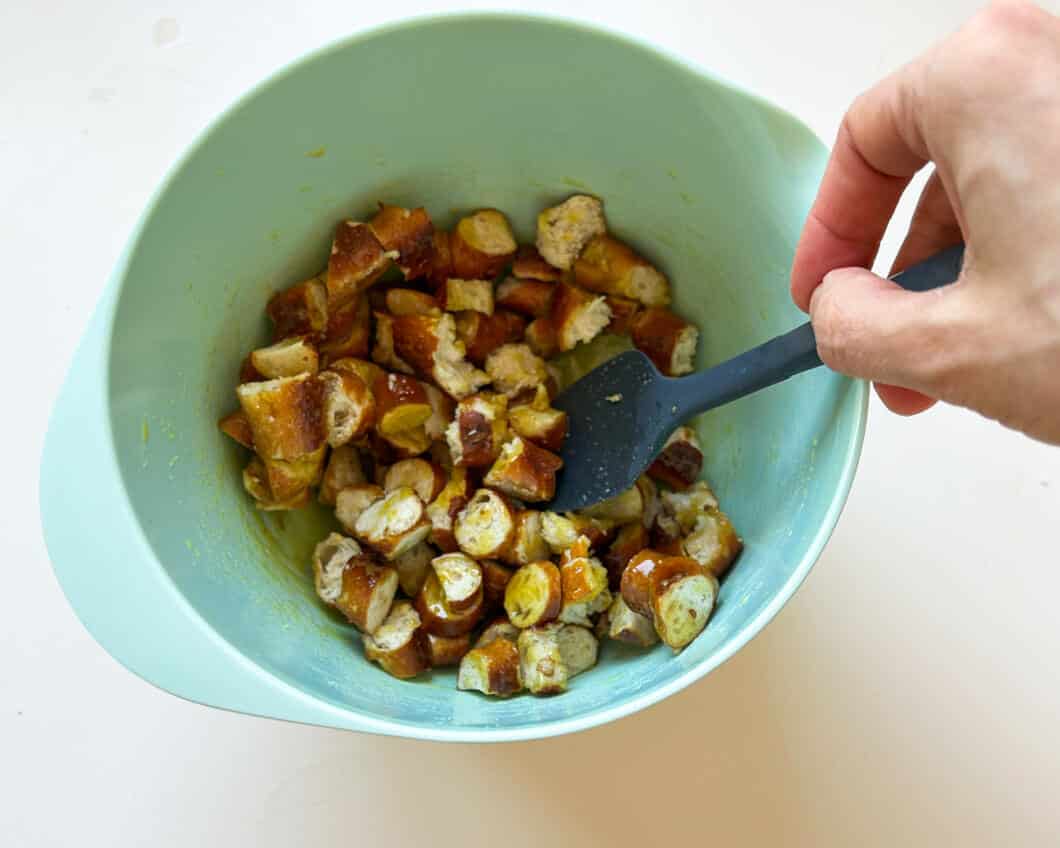 - Die Marinade über den Brezelstückchen verteilen und alles gut miteinander vermischen, sodass die Stücke gleichmäßig damit überzogen sind.
