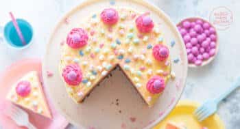 - Zum Verzieren Sahne mit Sahnesteif und Zucker steifschlagen und einfärben. Kleine Tupfen auf den Kuchen spritzen. Nach Belieben mit gefriergetrockneten Beeren und natürlich bunten Streuselchen dekorieren. Mit einem scharfen Messer in Stücke schneiden.