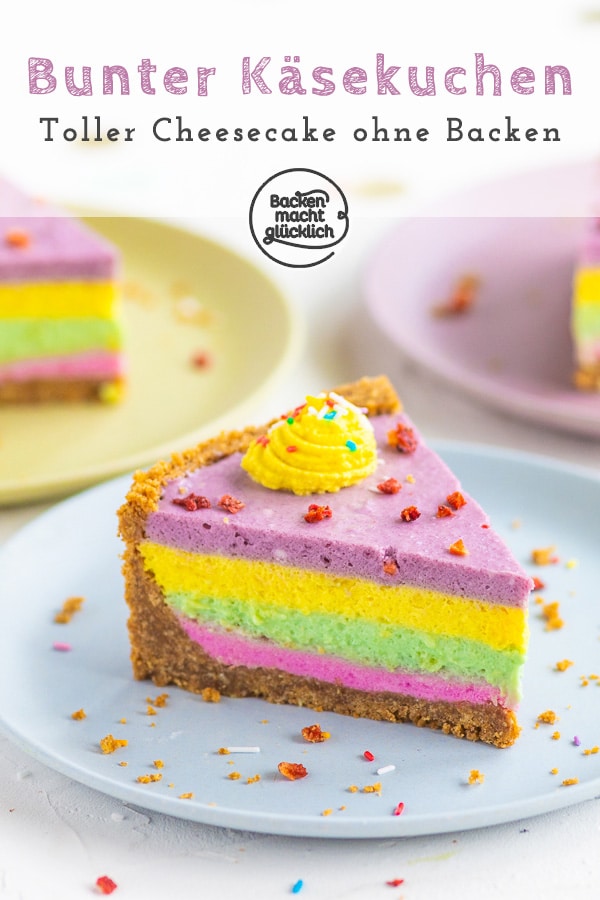Ich würde mich riesig freuen, wenn ich euch ein bisschen Lust auf mein Gute-Laune-Rezept machen konnte. So ein bunter Käsekuchen ohne Backen macht einfach Spaß. Genauso übrigens wie der klassische Regenbogenkuchen vom Blech oder die kunterbunten Konfettimuffins 🙂