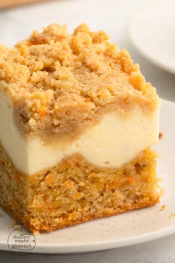 Der Karottenkuchen-Cheesecake ist die perfekte Kombination aus 3 ohnehin schon leckeren Teilen. Wir mögen v.a. die spannenden Konsistenzen-Kontraste aus saftigem Carrot Cake Boden, cremiger Frischkäse-Schicht und buttrig-knusprigen Zimtstreuseln. Es handelt sich um ein kreatives Rezept, das Kindern & Erwachsenen schmeckt; unsere Kleinen können in dieser Form sogar von Gemüse nicht genug bekommen 😉 . Der Carrot Cake Cheesecake vom Blech ist unkompliziert, weil es keinerlei heikle Schritte gibt. Er lässt sich super im Voraus vorbereiten und ist gut für Feiern, Brunch-Einladungen oder Buffets gerade in der Osterzeit geeignet. Last but not least: Das Rezept ergibt hohe Schnitten bzw. Bars, die hübsch aussehen.