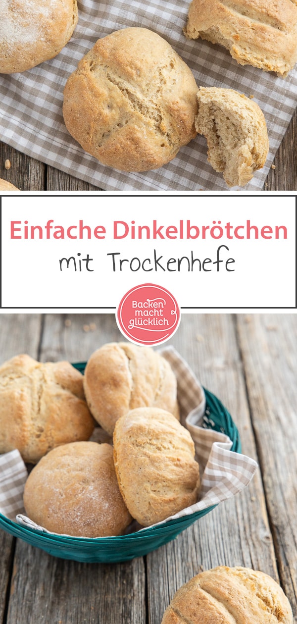 Für das Gelingen der Brötchen mit Dinkelmehl und Trockenhefe ist es wichtig, dass man im Ofen Dampf erzeugt, etwa mit einem Schälchen voller Wasser. Außerdem bestreiche ich sowohl das rohe als auch das fertige Gebäck immer mit etwas Wasser, was die Oberfläche hübscher macht. Lasst euch die einfachen, schnellen Dinkelbrötchen schmecken! Und schaut euch gerne auch meine vielen anderen Brötchenrezepte sowie Brote an, wie beispielsweise die Mini-Brötchen. Ebenso darunter die hellere Alternative zum heutigen Rezept, ganz klassische Brötchen wie vom Bäcker.