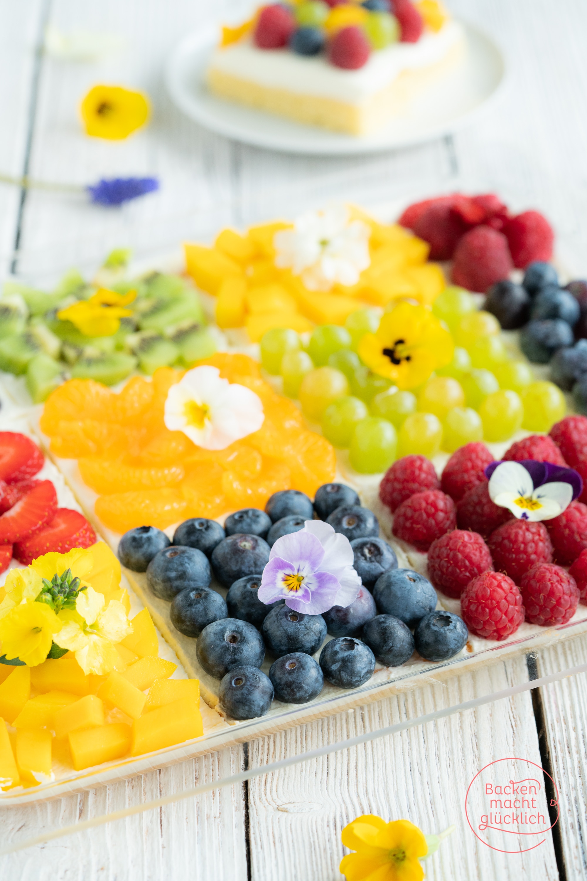 Die Krönung sind natürlich bunte Früchte. Und ein paar Blümchen aus Nachbars Vorgarten 😉 Ich bin zugegebenermaßen schon ein bisschen verliebt in die frisch-fruchtige-farbige Optik. Das Dekorieren und Vernaschen hat viel Spaß gemacht. Wenn man den Blechkuchen in kleine Quadrate teilt und sortenweise belegt, erhält jeder sein ganz persönliches Lieblings-Stückchen. Aber auch gemischt, quasi mit Obstsalat-Belag, ist der Kuchen herrlich. Das Rezept ist super variabel. Und eine tolle Alternative zu Springform-Rezepten wie der klassischen Konditortorte oder dem Obstboden aus Rührteig.