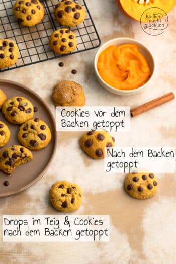 - Schokodrops richtig verwenden: Wie ihr auf dem Bild seht, gibt es große optische und geschmackliche Unterschiede; je nachdem, ob die Schokolade schon vor dem Backen auf den Teig kommt, nur danach, oder sowohl im Teig steckt als auch nach dem Backen obendrauf kommt. Letzteres ist mein absoluter Favorit. Hier verbrennt oder verschmiert nichts im Ofen; ihr bekommt stattdessen die volle Schoko-Ladung und die Kürbiscookies sehen einfach toll aus.