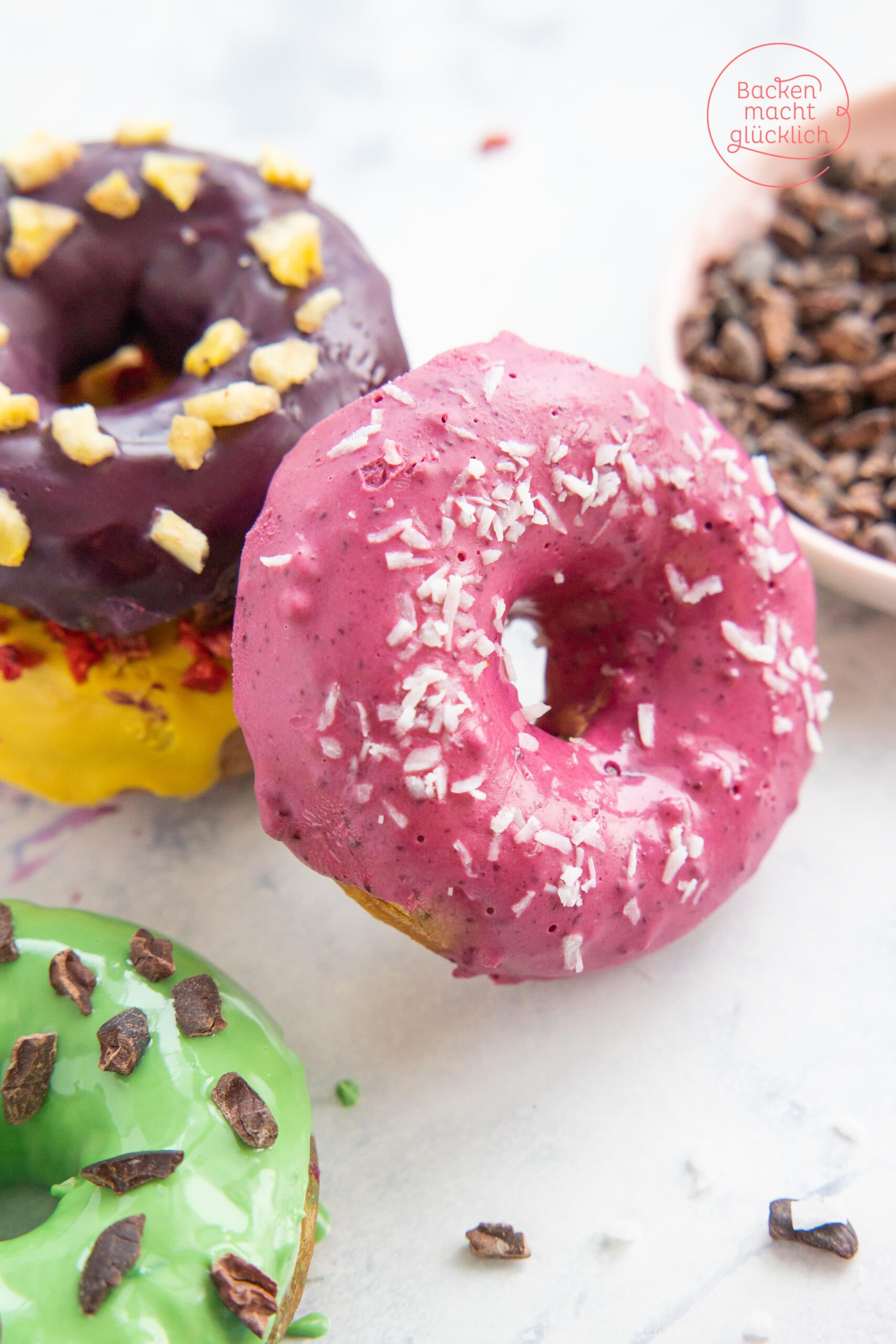 Gut, dass die Natur so einige tolle Backzutaten auf Lager hat 😉 . Konkret: Kokosraspel, Beeren, Kakao Nibs und Co. Um die Donuts ohne Lebensmittelfarbe bunt zu bekommen, kann man z.B. färbende Lebensmittel-Pulver verwenden. Wer Gelfarbe oder Farbpasten verwendet, sollte die Zubereitungshinweise beachten und muss die Dosierung anpassen.