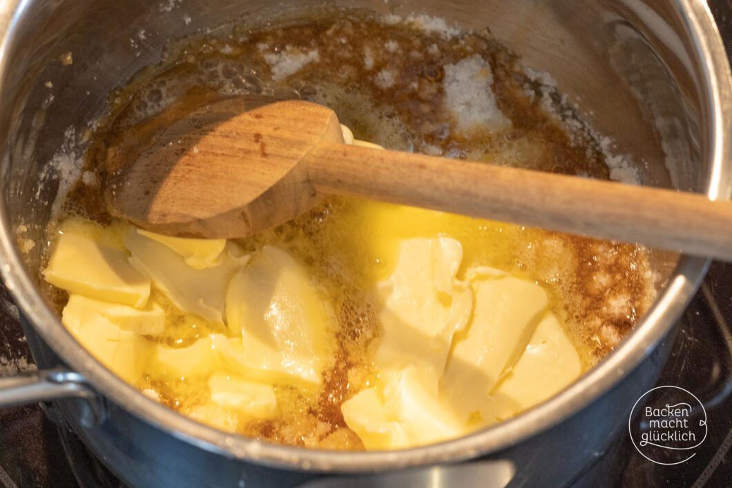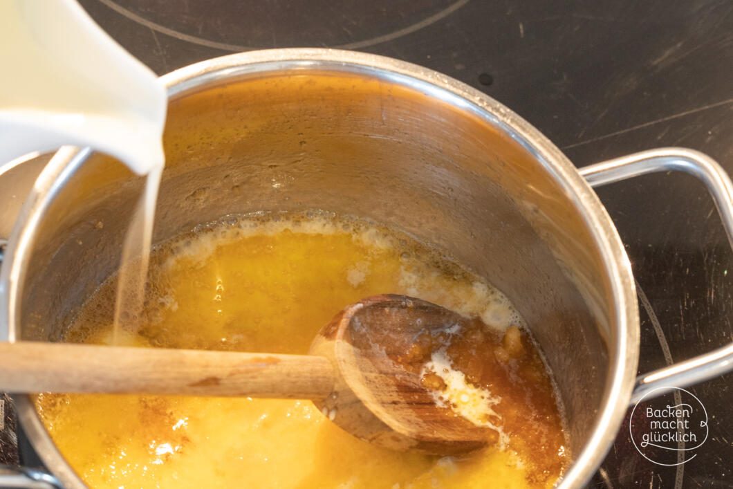 - Sobald der karamellisierte Zucker goldbraun, aber noch nicht zu dunkel ist, nach und nach die Butterstückchen unterrühren, bis sie komplett geschmolzen sind. Dann kurz ohne weiteres Rühren köcheln lassen.
