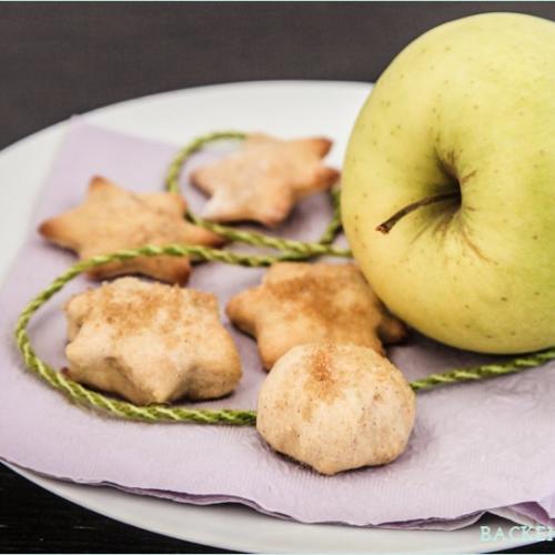 Den Mürbteig ohne Butter auszuwellen und daraus Plätzchen auszustechen, war kein Spaß. Ganz ehrlich. Nervtötend. Die Konsistenz des Teigs bewegte sich irgendwo zwischen Rührteig und Hefeteig (jedenfalls nicht Mürbteig); der Teig schnurrte beim Ausrollen immer wieder zusammen, war sehr klebrig und zäh. Als ich Sterne und Herzen ausstechen wollte, blieb der Teig permanent am Keksausstecher kleben. Also habe ich mir überlegt, einfach Keks-Kugeln zu formen und diese mit kleinen Apfelstücken zu füllen (auch weil ich gleich befürchtet habe, die fertigen Plätzchen könnten etwas trocken werden…).