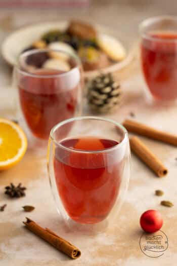 - Die Zutaten und Gewürze sind nur eine Art Grundgerüst, das man wunderbar variieren kann. Anstelle von normalem Früchtetee passen auch ähnliche Sorten wie Wintertee. Wir machen den Punsch am liebsten mit Apfelsaft oder einer Mischung aus Apfel, Orangen- und Traubensaft.