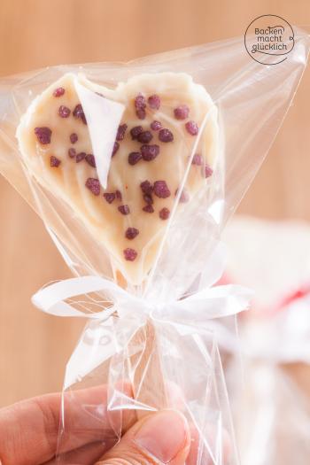 - Eine weitere Variante sind kleine Herzkuchen am Stiel. Dafür die Cake-Pop-Sticks oder Holzstäbchen ca. 2 cm in die Kuvertüre tauchen, in die Herzen stecken und festwerden lassen.