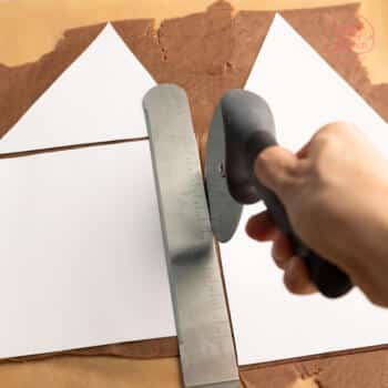 - Nun den Teig mit einem scharfen Messer oder Pizzaroller entlang der Papierschablonen schneiden, dabei am besten zusätzlich eine lange Winkelpalette oder ein Lineal auflegen, damit man wirklich gerade schneidet.