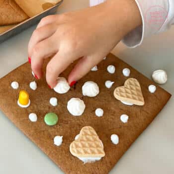 - Kinder mit einbeziehen: Sie lieben das Verzieren der Dachplatten! Wir haben die Süßigkeiten übrigens ganz am Anfang erstmal „trocken“ aufgelegt, um zu sehen, wie sie schön angeordnet werden.
