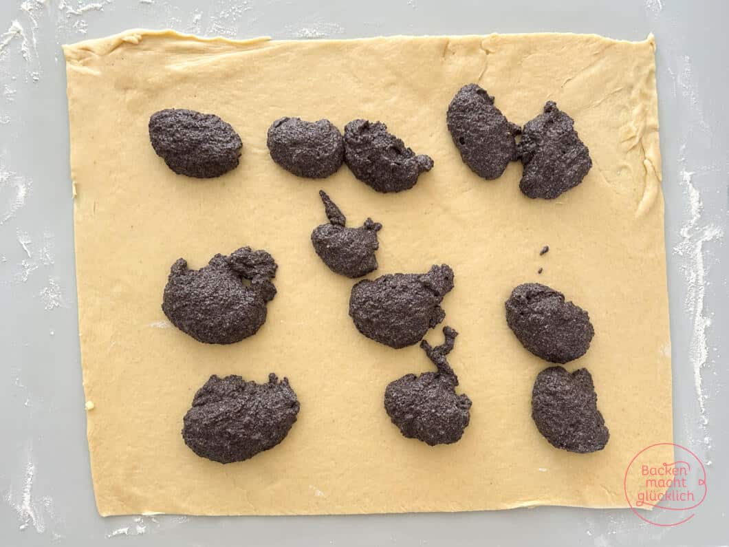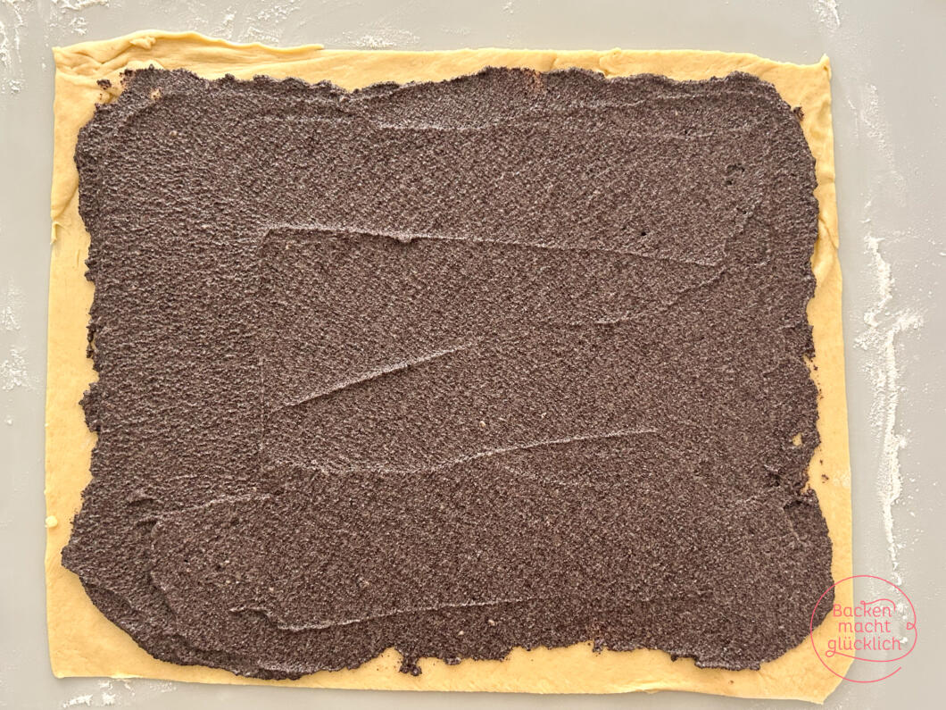 - Den Teig entweder direkt auf Backpapier oder auf einer leicht bemehlten Arbeitsfläche bzw. Backmatte zu einem großen Rechteck von ca. 40 * 30 cm ausrollen. Die lauwarme Mohnfüllung darauf verteilen.