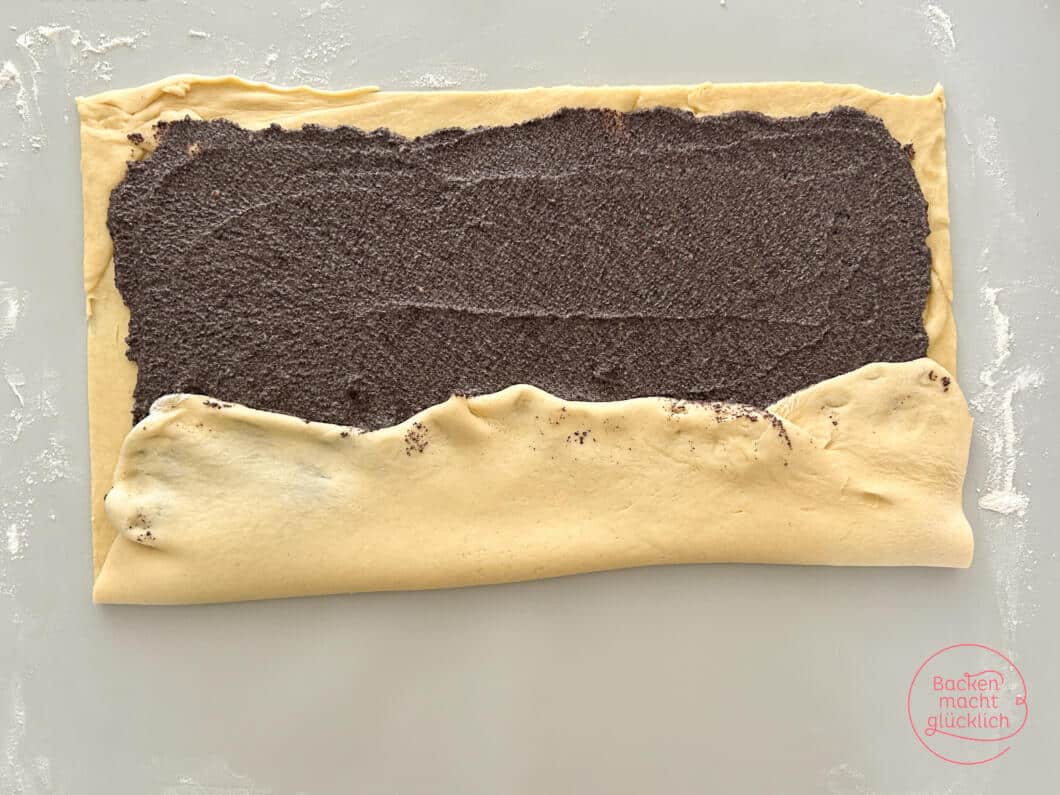 - Mohnstriezel formen: Der Teig wird zu einem sehr großen Rechteck ausgerollt und bestrichen. Diese Platte faltet man in 3 Schritten wie ein Päckchen. So bleibt die Füllung gut im Inneren und das Gebäck erhält seine typische flache Form.