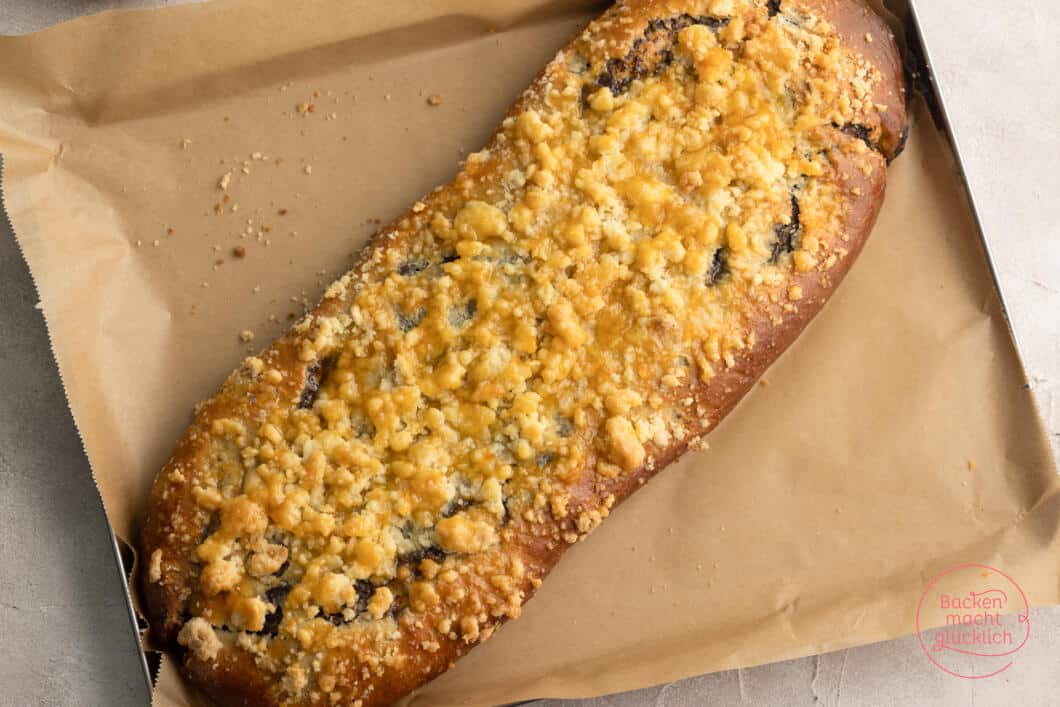 - Belegen: Damit die Streusel auf dem Mohnstriezel „kleben“, bepinsle ich die Oberfläche vorher leicht mit Milch.