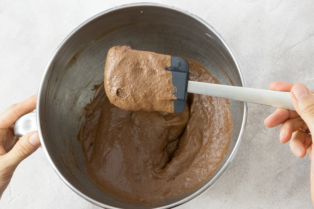 A und O ist es, die Masse nicht zu über-schlagen. Zwar sollen Eigelbe und Zucker am Anfang sehr cremig geschlagen werden; sobald alle Zutaten zusammenkommen, darf man diese aber nur noch ganz vorsichtig unterheben, sodass die Luft nicht entweicht. Das geht am besten mit einem Teigschaber oder Schneebesen. Nicht mit dem Handmixer rühren!