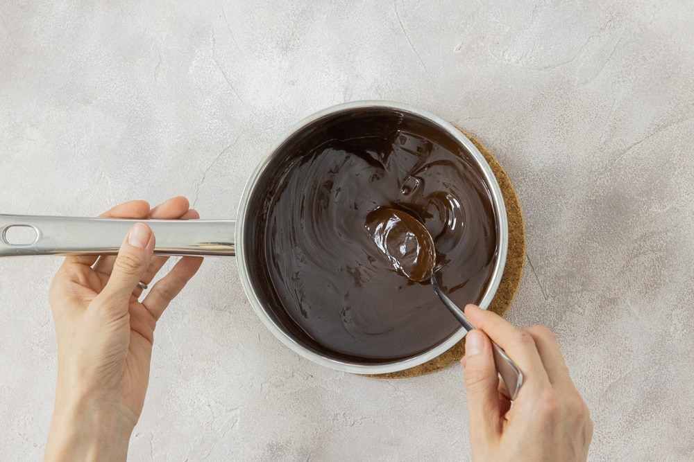 - Die Schokolade klein hacken. Zusammen mit der Butter im heißen Wasserbad vorsichtig schmelzen lassen, einmal gut durchrühren und zum Abkühlen beiseite stellen. Es darf kein Tropfen Wasser in die Schokomasse kommen!