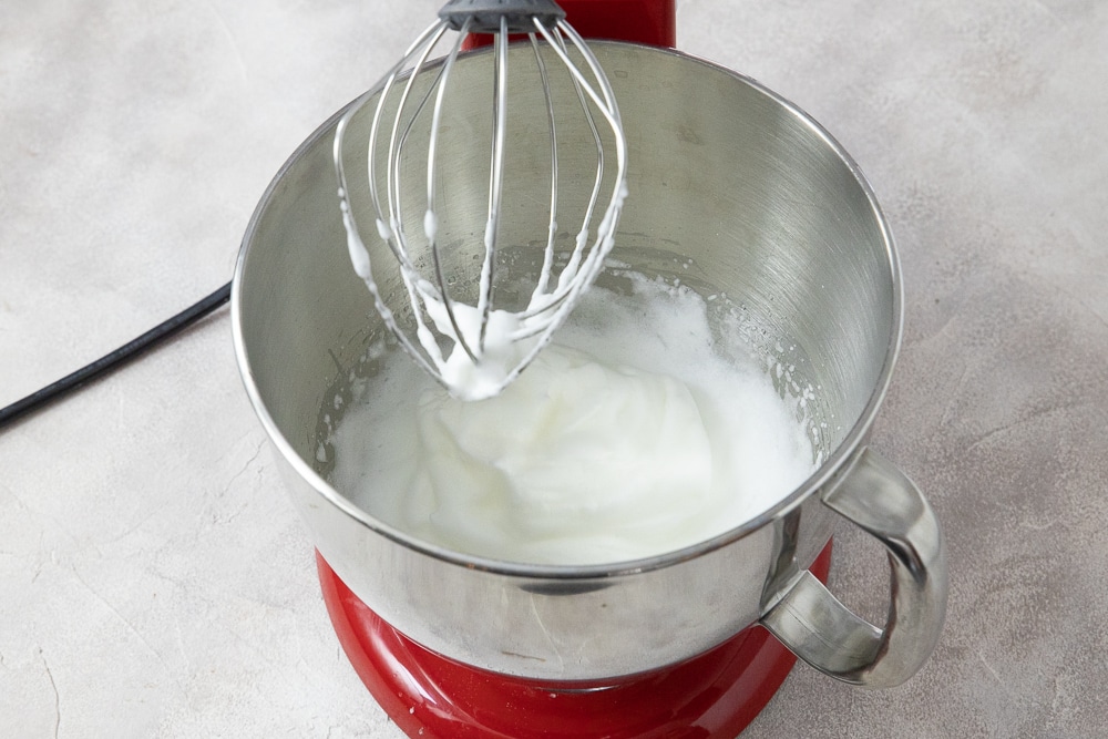 - Die Eiweiß in einer sauberen Schüssel mit ganz sauberen Quirlen halb steif bzw. cremig schlagen.