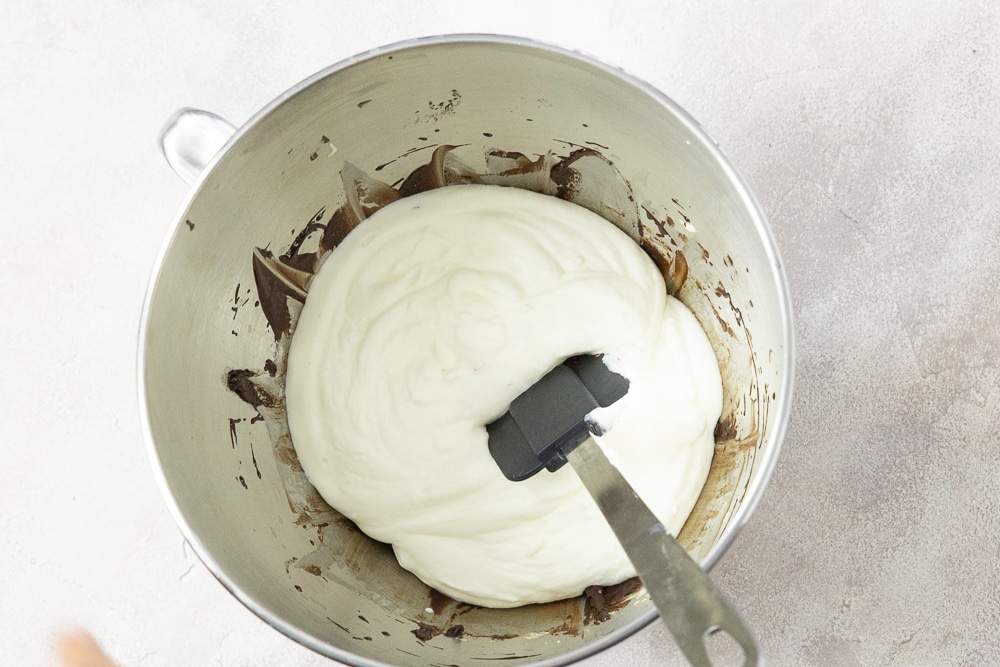- Dann Eischnee und Sahne zugeben und ganz vorsichtig per Hand mit einem Teigschaber oder Schneebesen so lange unterheben, bis die Mousse homogen ist.