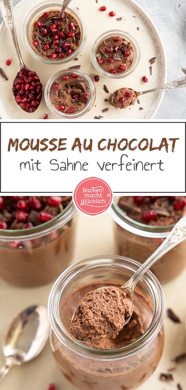 - Beim Vermengen sollte so wenig Luft wie möglich entweichen. Mousse in 4 kleine Gläser oder Dessertschälchen füllen und mind. 4 Stunden oder über Nacht kühlstellen. Nach Belieben mit Schokoraspeln, Schlagsahne, Beeren oder Granatapfelkernen dekorieren.