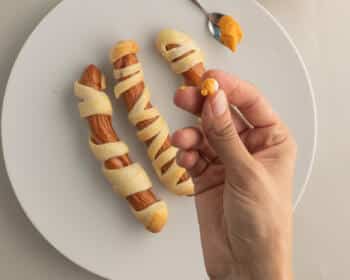 Kleber: Um die Augen auf den Mumienwürstchen zu befestigen, habe ich jeweils eine Mini-Menge Hummus verwendet. Lebensmittelkleber, dickes Ketchup oder Senf klappen auch.