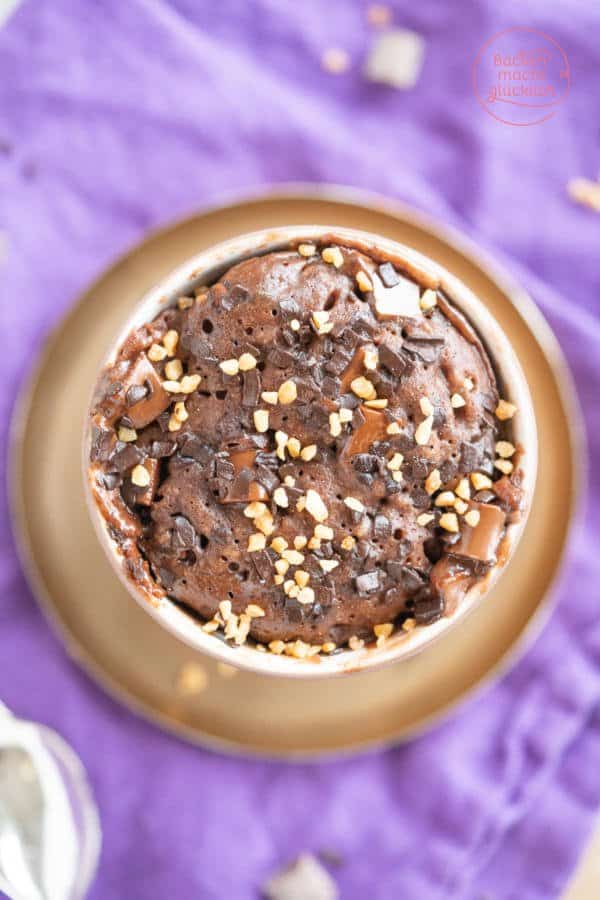 - Die Butter in einer großen Tasse bei niedriger Wattzahl in der Mikrowelle schmelzen. Nougat ebenfalls kurz mit erwärmen. Ei und Zucker mit in die Tasse geben, alles mit einer Gabel kräftig verquirlen. Die restlichen Zutaten ebenfalls gut unterrühren. Nach Belieben mit Schokodrops o.ä. bestreuen.