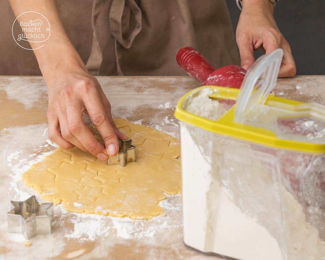 - Ofen auf 175 Grad Ober- und Unterhitze vorheizen. Die erste Teigportion aus dem Kühlschrank holen und kurz Zimmertemperatur annehmen lassen. Auf etwas Mehl, einer Backmatte oder noch besser zwischen zwei Lagen Folie nicht zu dünn ausrollen. Ca. 25-30 Plätzchen ausstechen und mit etwas Abstand zueinander auf ein Blech mit Backpapier setzen.