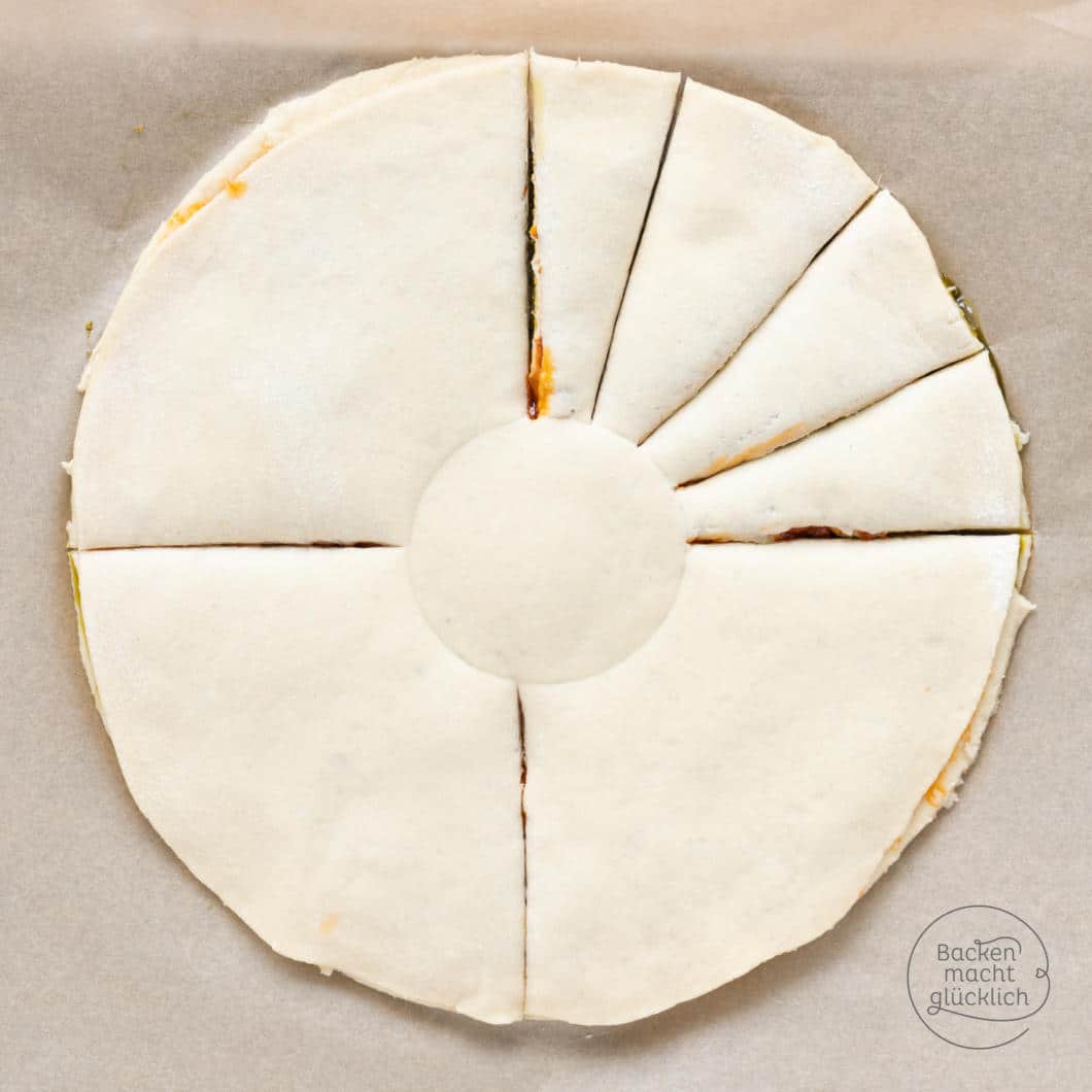 - Teig-Sandwich mit einem scharfem Messer in 12-16 gleich große Stücke schneiden, dabei innen nur bis zum Kreis gehen.