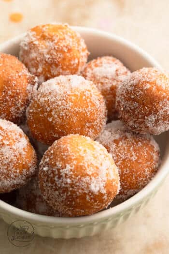 - Die fertigen Bällchen mit einem Schaumlöffel o.ä. aus dem Fett holen, ganz kurz über dem Fett abtropfen lassen und in einem tiefen Teller mit Zucker wälzen. Den Zucker am besten nicht auf einmal, sondern portionsweise in den Teller geben, damit er nicht zu fettig wird und klumpt.