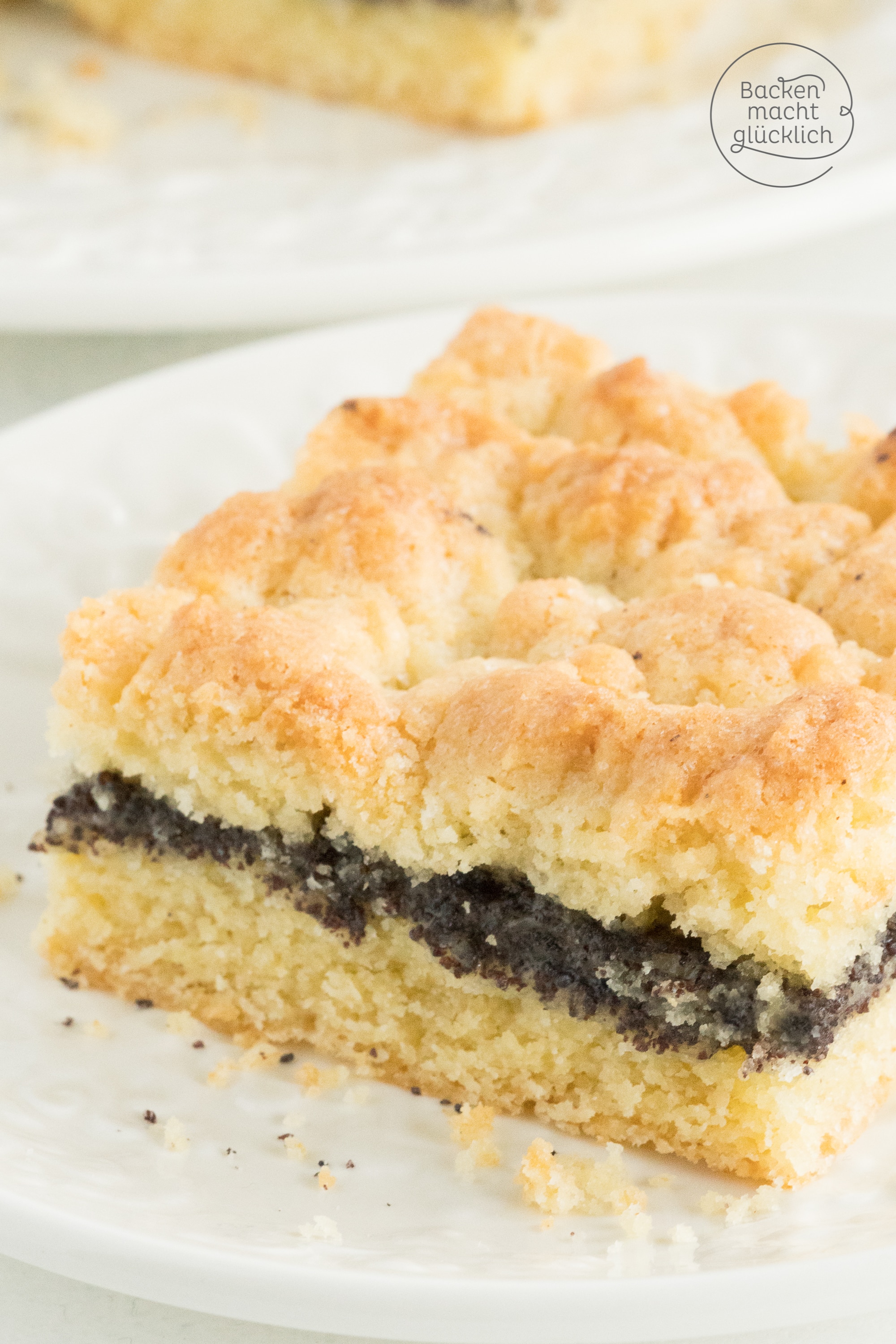 Köstlicher Mohnkuchen vom Blech: Dieser saftige Mohnkuchen mit Streuseln und Pudding ist durch den Knetteig schnell gemacht - und kommt immer gut an!