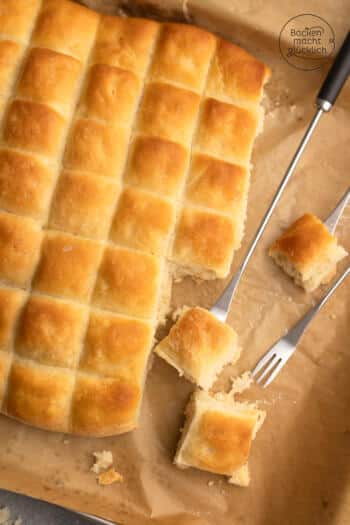 - Die richtige Größe für Fonduebrot-Würfel ist meines Erachtens ca. 3 × 3 cm. Größer sollten die Stücke fürs Tunken nicht sein, da sie sonst unhandlich werden und schlechter essen lassen. Wenn ihr kleinere Happen möchtet, könnt ihr den Teig flacher formen und mehr Quadrate draus machen.