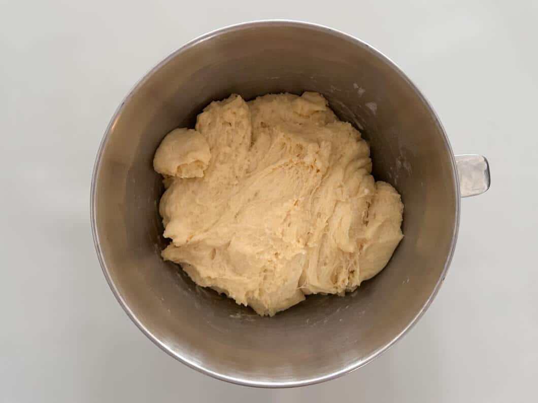 - Nun die restliche lauwarme Milch, weiche Butter, Eier und Salz dazugeben. Alles ca. 5 Minuten zu einem eher weichen, aber glatten Teig verkneten, der sich vom Schüsselrand löst. Teig an einem warmen Ort abgedeckt ca. 90 Minuten gehen lassen, bis sich das Volumen deutlich vergrößert hat.
