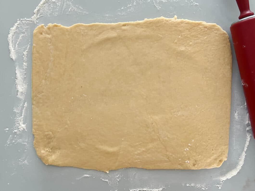 - Eine große Kastenform (ca. 30 cm) einfetten und am besten zusätzlich mit Backpapier auslegen. Den Teig auf einer leicht bemehlten Arbeitsfläche zu einem großem Rechteck ausrollen (ca. 35 * 30 cm).