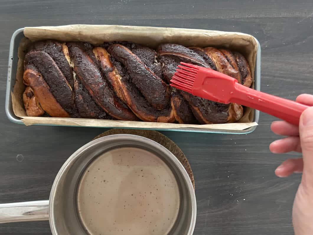 - Während die Babka backt den Sirup vorbereiten. Zucker und Wasser kurz aufkochen, bis sich der Zucker vollständig gelöst hat. Die heiße Babka direkt nach dem Backen großzügig mit dem heißen Sirup bepinseln. Er zieht ein, sorgt für Saftigkeit und Glanz. Babka komplett abkühlen lassen und dann vorsichtig mit einem großen scharfen Messer schneiden.