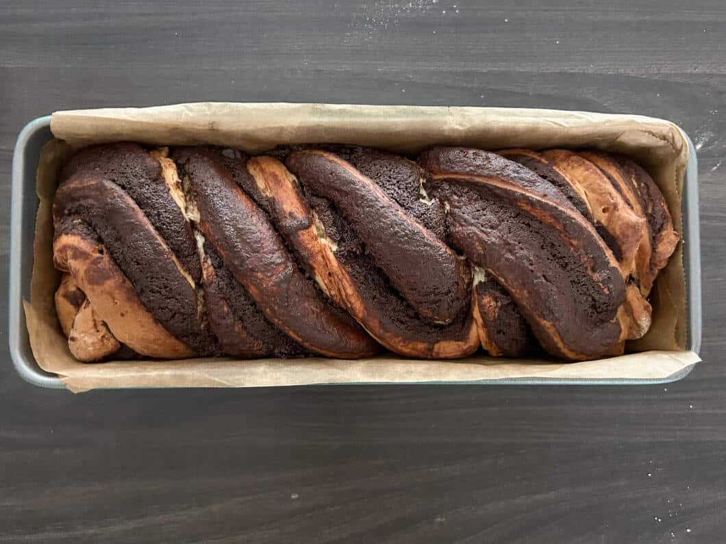 - Backofen auf 170 Grad Ober- und Unterhitze vorheizen. Babka ca. 45-50 Minute backen. Dabei nach etwa 30 Minuten locker mit Alufolie abdecken, damit die Oberfläche nicht zu dunkel wird. Um herauszufinden, wann die Babka fertig ist, eine Stäbchenprobe in der Mitte machen: Schokocreme am Stäbchen ist normal, roher Teig nicht.