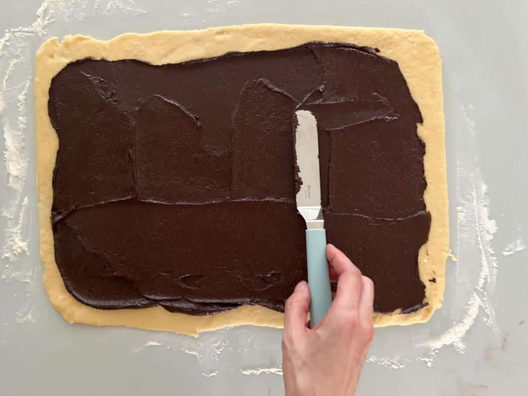 - Füllen und aufrollen: Nun wellt man den Teig rechteckig aus, bestreicht ihn mit der Schokopaste und rollt ihn einer großen dicken Teigrolle auf – ähnlich wie bei Zimtschnecken.