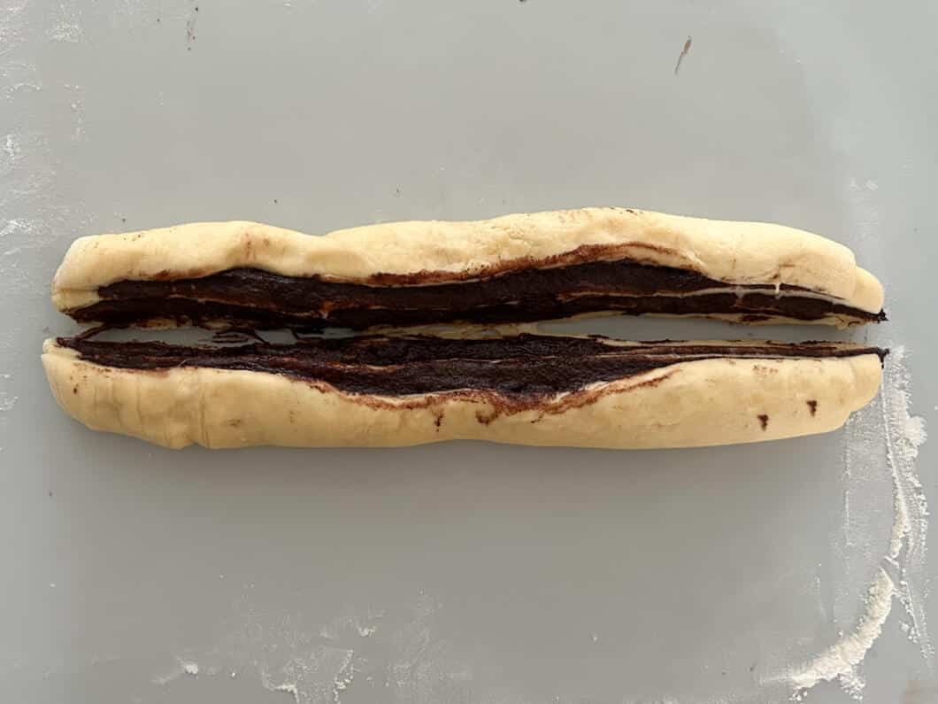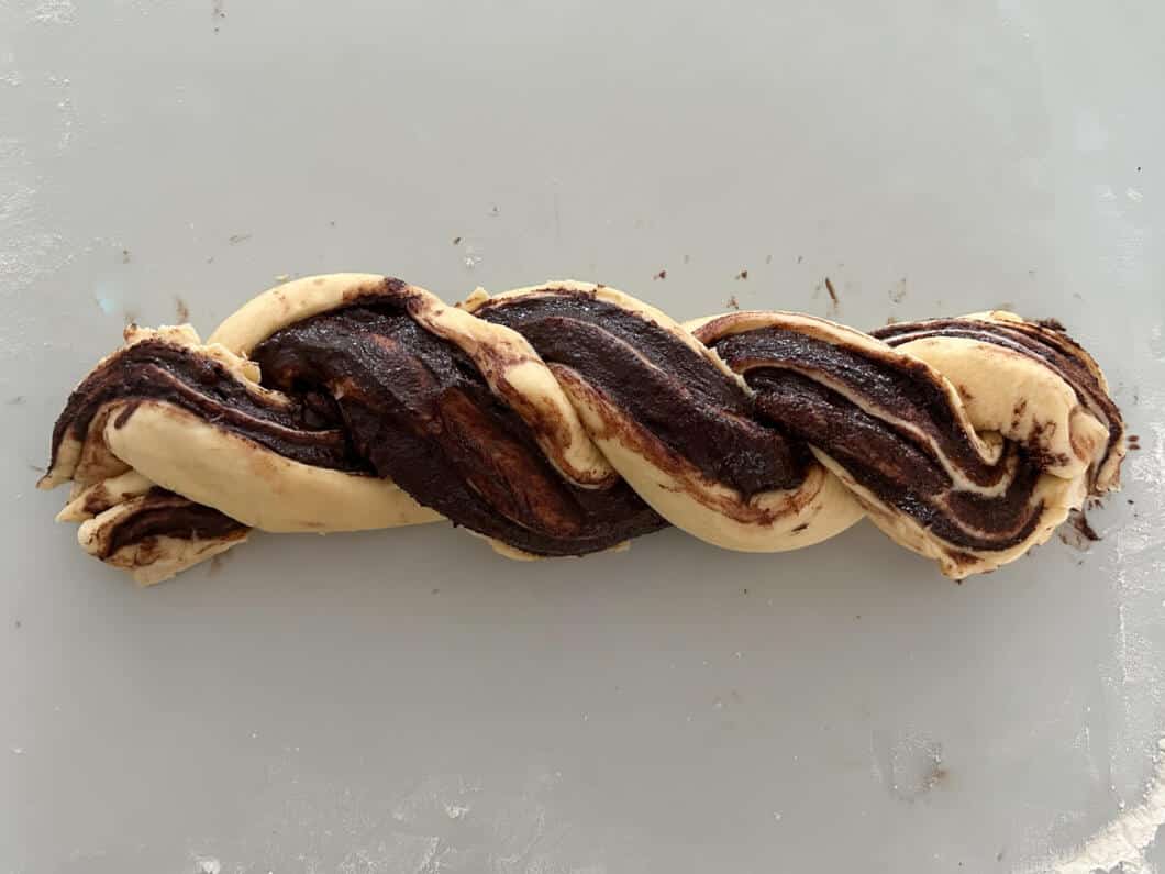 - Formen: Die Rolle längs halbieren und die Stränge locker miteinander verdrehen, fast wie bei einer Kordel. Dadurch entstehen die typischen Babka-Wirbel. Das Prinzip verwende ich z.B. auch im Nusszopf. Wenn eure Babka etwas unperfekt oder verschmiert aussieht: Gar kein Problem!