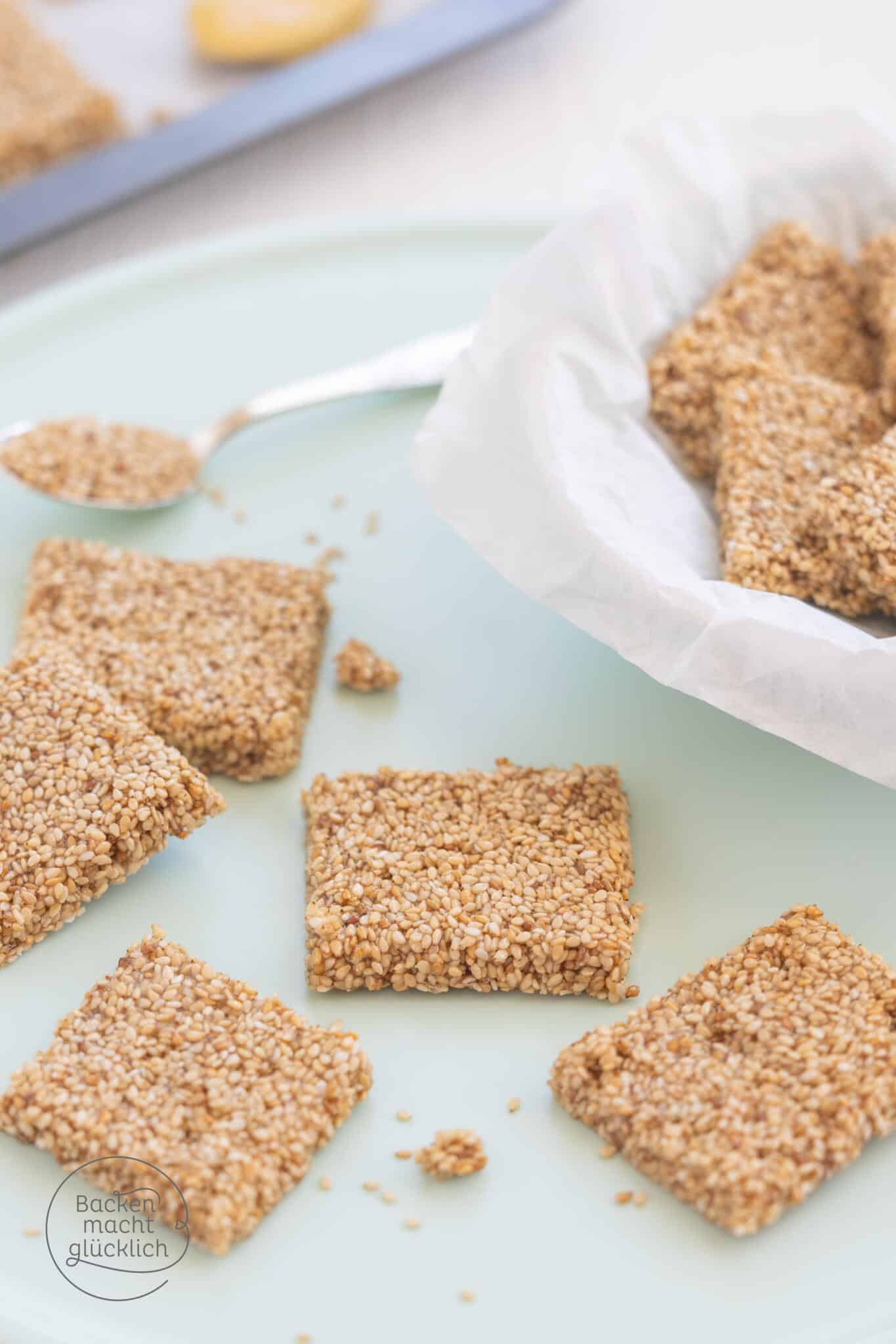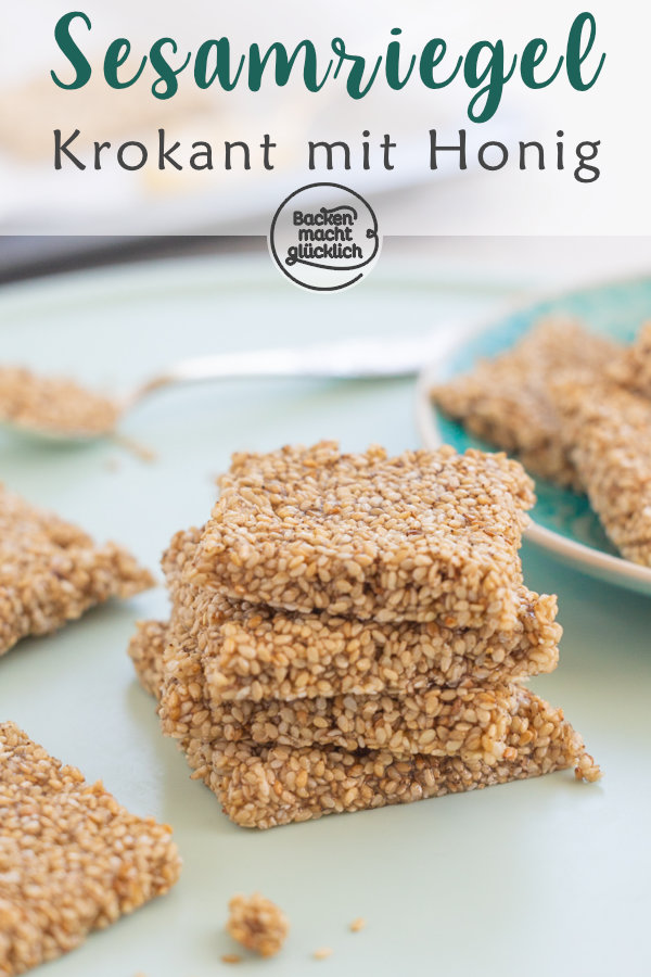 - Wir lieben die etwas weich-zähe Konsistenz. Richtig knackig und knusprig werden die Riegel, wenn ihr mehr oder sogar nur Zucker verwendet. Diesen in der Pfanne karamellisieren lassen und zusammen mit dem Sesam 1-2 EL Margarine oder Öl zugeben.