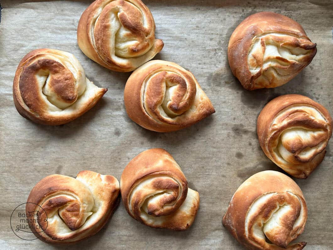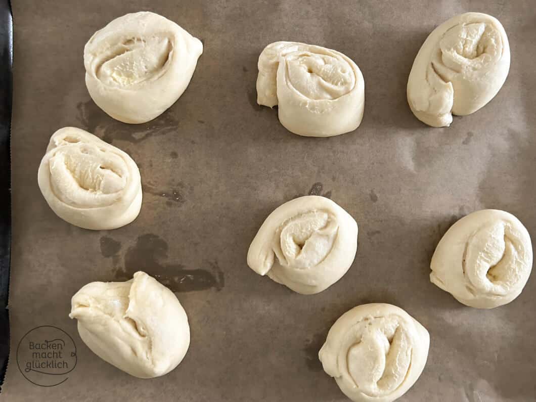 - Alle Stücke mit der offenen Schnittfläche nach oben auf ein mit Backpapier belegtes Blech setzen; dazwischen etwas Abstand lasen. Jede Art Teigschnecke mit der Hand leicht plattdrücken, damit sie stabil steht und nicht umkippt. Die ungebackenen Brötchen ca. 20 Minuten bei Raumtemperatur gehen lassen. Währenddessen den Ofen auf 220 Grad Ober- und Unterhitze vorheizen.