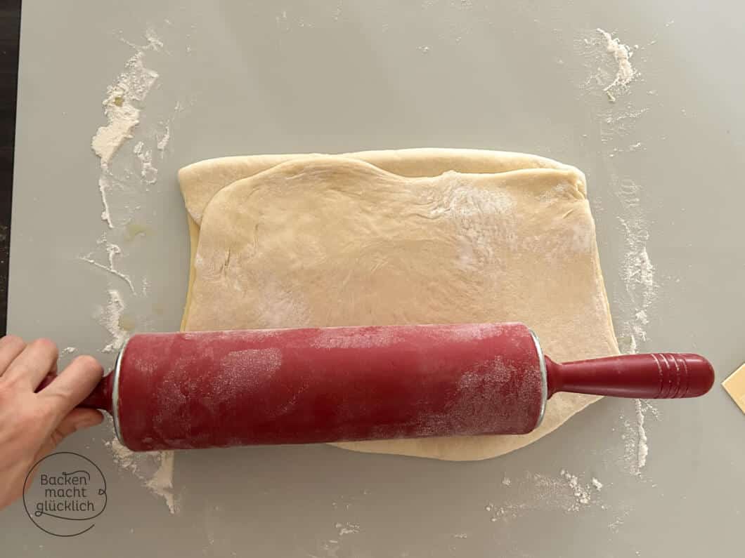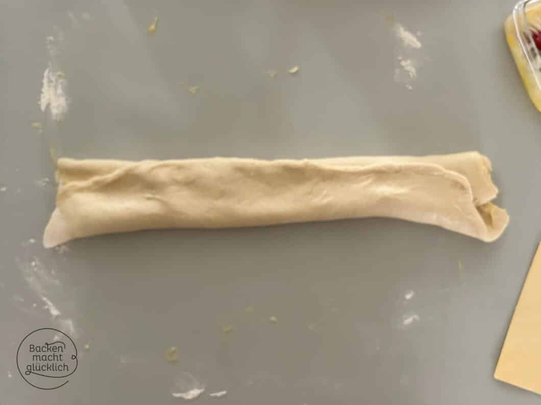 - Ausrollen, buttern und falten. Ihr müsst den Teig, ähnlich wie bei selbstgemachtem Blätterteig, mehrmals „einigermaßen rechteckig“ ausgerollen, mit Butter bestreichen, easy zu einer Art Brief falten und dann ruhen lassen. Diese Technik sorgt für Saftigkeit und eine leichte Schichtung.