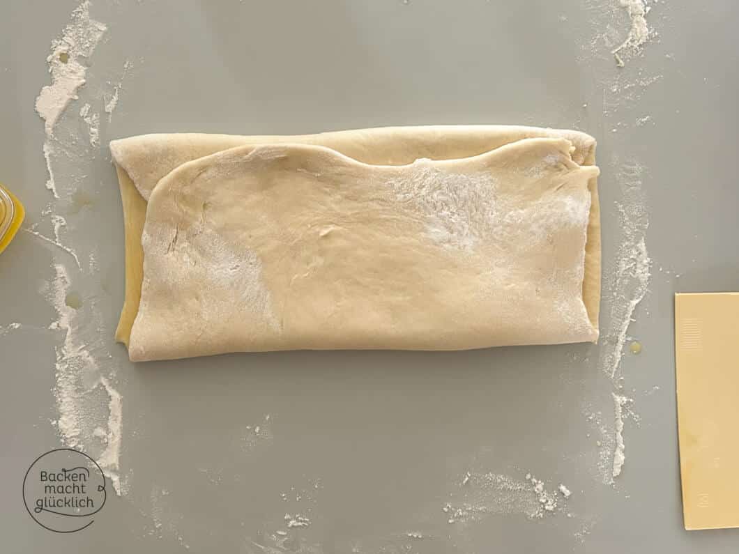 - Für den 3. Durchgang den Teig erneut ausrollen. Hier kann es sein, dass der Teig danach eher quer als hoch vor euch liegt, da er sich nicht mehr hochkant ausrollen lässt. Ein letztes Mal buttern. Dreifach falten.