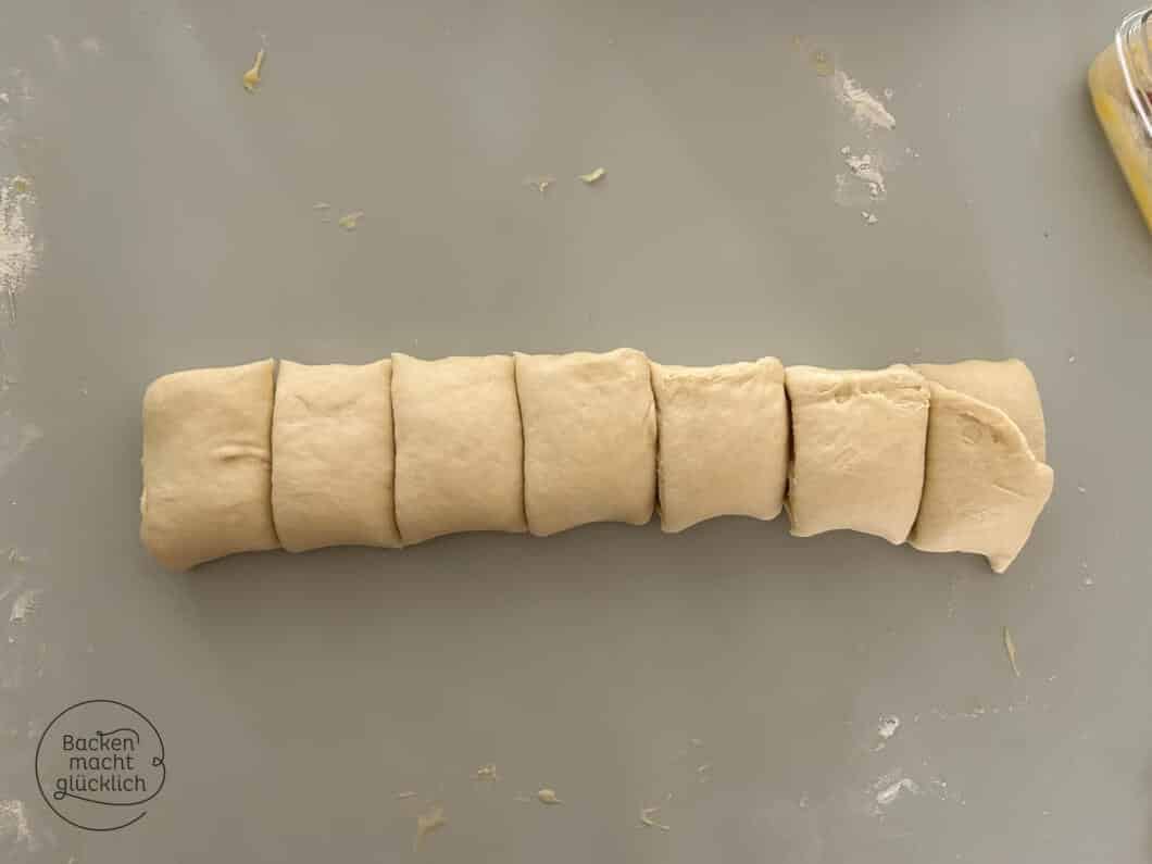 - Teigrolle mit einer Teigkarte oder einem großen scharfen Messer in 10-12 gleich große Stücke schneiden, ohne viel zu drücken.