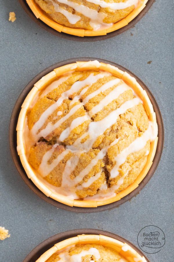 - Für die optionale Deko bzw. den Drizzle ca. 60g Puderxucker mit ca. 1 EL Milch zu einem zähen Guss verrühren und mit einem Löffelchen in Streifen auf den Muffins verteilen.