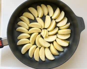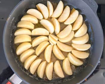 - Danach die vorbereiteten Apfelspalten dekorativ vorsichtig reihum in das heiße Karamell legen und 4–5 Minuten leicht köcheln lassen. Ofen auf 180 Grad Ober- und Unterhitze vorheizen.