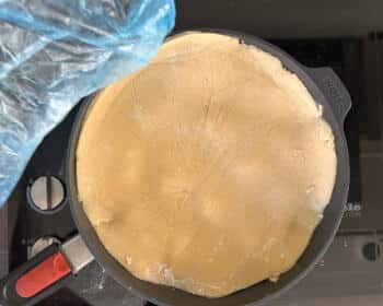 - Um den Teig sicher und stressfrei zu platzieren, rate ich dazu, ihn auf einem aufgeschnittenen Gefrierbeutel oder Backpapier auszurollen, mit dieser Unterlage anzuheben und so vorsichtig auf die Äpfel in der heißen Form bzw. Pfanne zu legen.