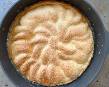 Ich empfehle euch daher eine schwere, ofenfeste Pfanne (aus Gusseisen bzw. emailliert) mit evtl. abnehmbarem Griff, die ihr vielleicht eh besitzt. Wir haben diese hier mit Innenmaß 26 cm. In der könnt ihr sowohl das Karamell machen als auch den Kuchen backen, die Hitze wird gleichmäßig verteilt, die Apfeltarte Tatin löst sich später super ohne extra Einfetten.