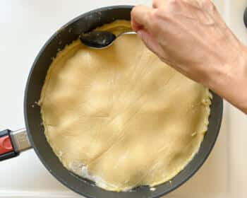- Die Ränder z.B. mit einem Löffel leicht nach unten schieben. Teigoberfläche mehrfach mit einer Gabel einstechen.