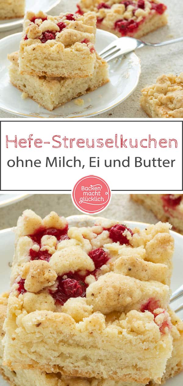 Dieser vegane Hefe-Streuselkuchen kommt dem Original wirklich nah: der Teig herrlich luftig, die Streusel wunderbar mürbe, und das ganze ohne tierische Zutaten. Veganer sowie Menschen, die auf Ei und Co allergisch reagieren, dürften sich über mein heutiges Rezept also freuen 🙂
