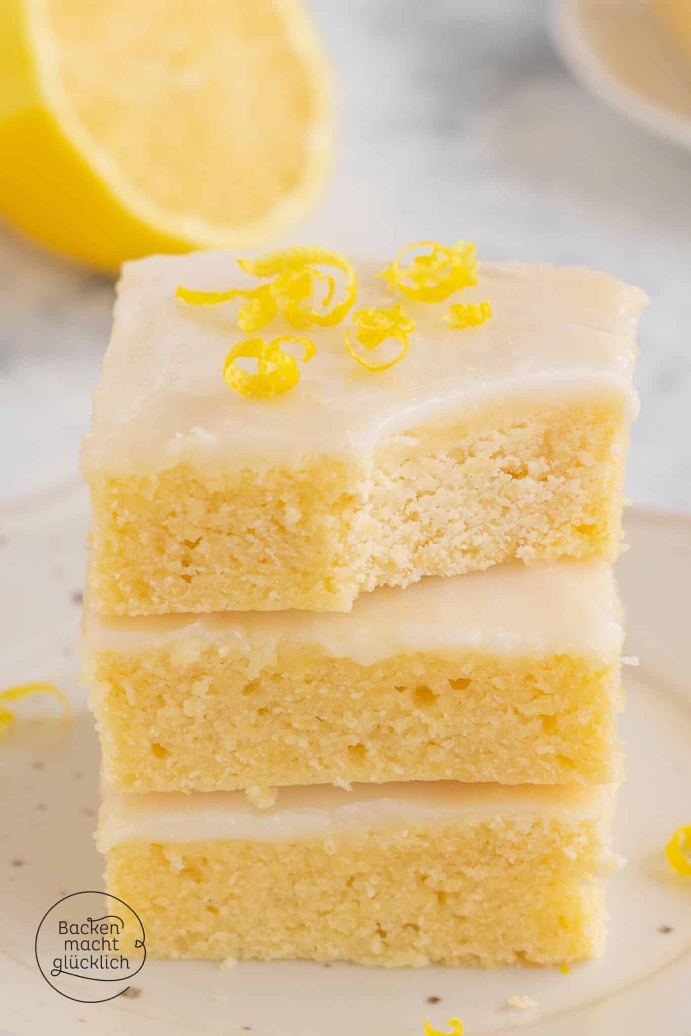 Anders als die normalen Vanille-Blondies enthält diese Variante keine Schokolade. Der Name Lemon Blondies bezieht sich also vor allem auf die typische Zubereitungsart (flüssige Butter kommt zu einem Eier-Zucker-Mix etc) und die super üppige fudgy Konsistenz. Achtung: Damit die Zitronen-Brownies perfekt werden, benötigt ihr am besten frischen Zitronensaft sowie einen Guss. Der ist nicht optional 😉 .